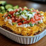 This 7 Layer Taco Dip is a crowd-pleasing appetizer that’s loaded with layers of flavorful ingredients like refried beans, sour cream, guacamole, and cheese. Perfect for parties, game day, or any gathering, it’s easy to assemble and always a hit when served with tortilla chips.