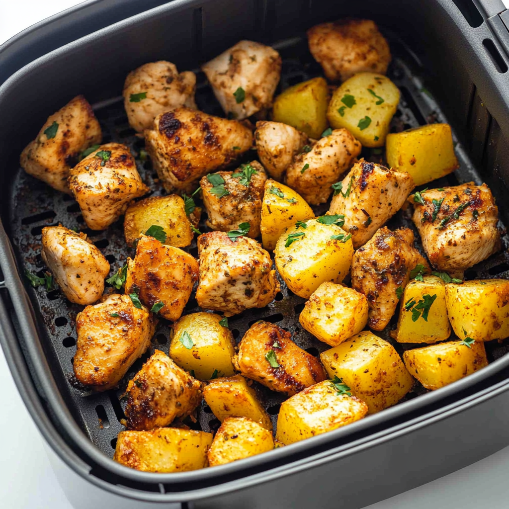 5. Air fry for 20–25 minutes, shaking the basket halfway through, until the chicken is cooked through and the potatoes are golden and crispy.