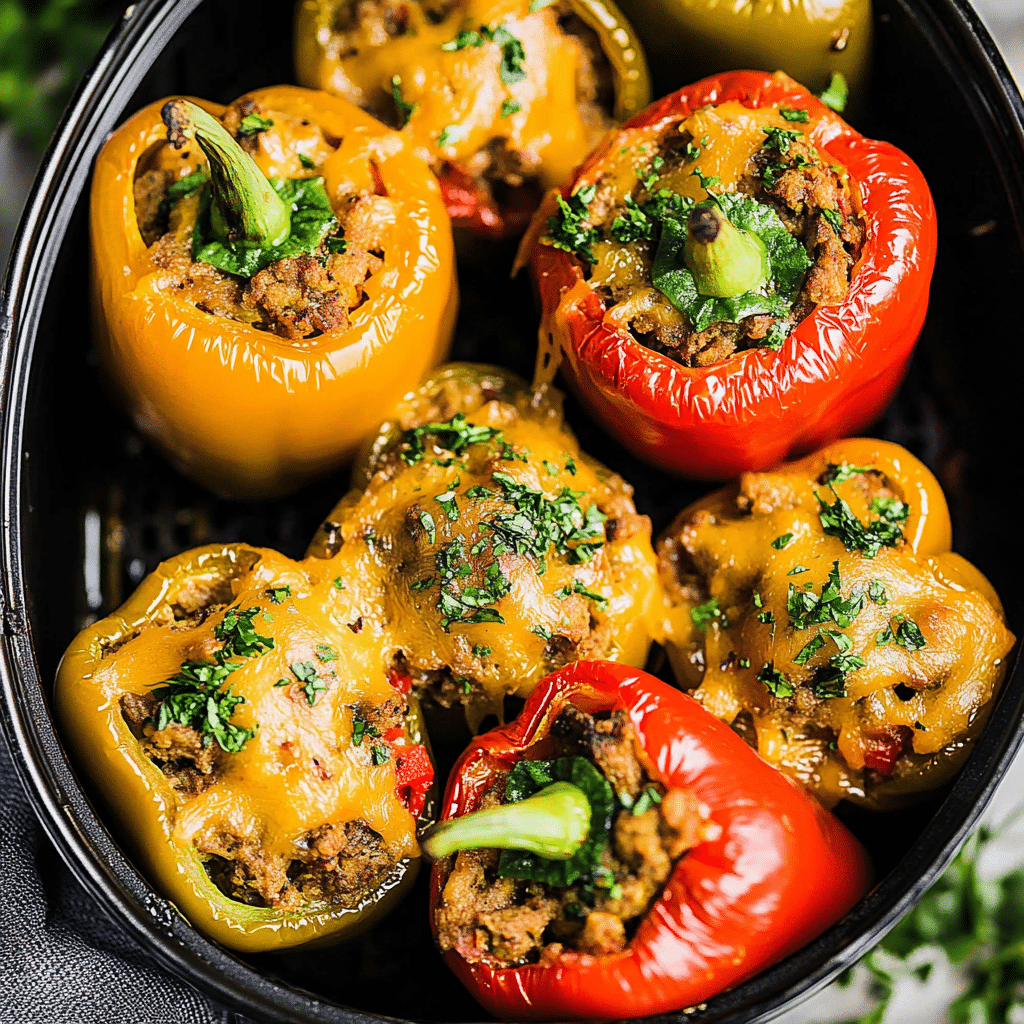 Air Fryer Stuffed Peppers are a quick and delicious way to enjoy a classic dish. Bell peppers are filled with a flavorful mixture of ground meat, rice, and seasonings, then cooked to perfection in the air fryer. A cheesy topping adds the perfect finishing touch!