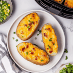 Air Fryer Twice Baked Potatoes are a creamy, cheesy, and crispy delight made faster and easier thanks to the air fryer. With fluffy mashed potato filling, melty cheese, and crisp skins, they make the perfect side dish or even a light meal.
