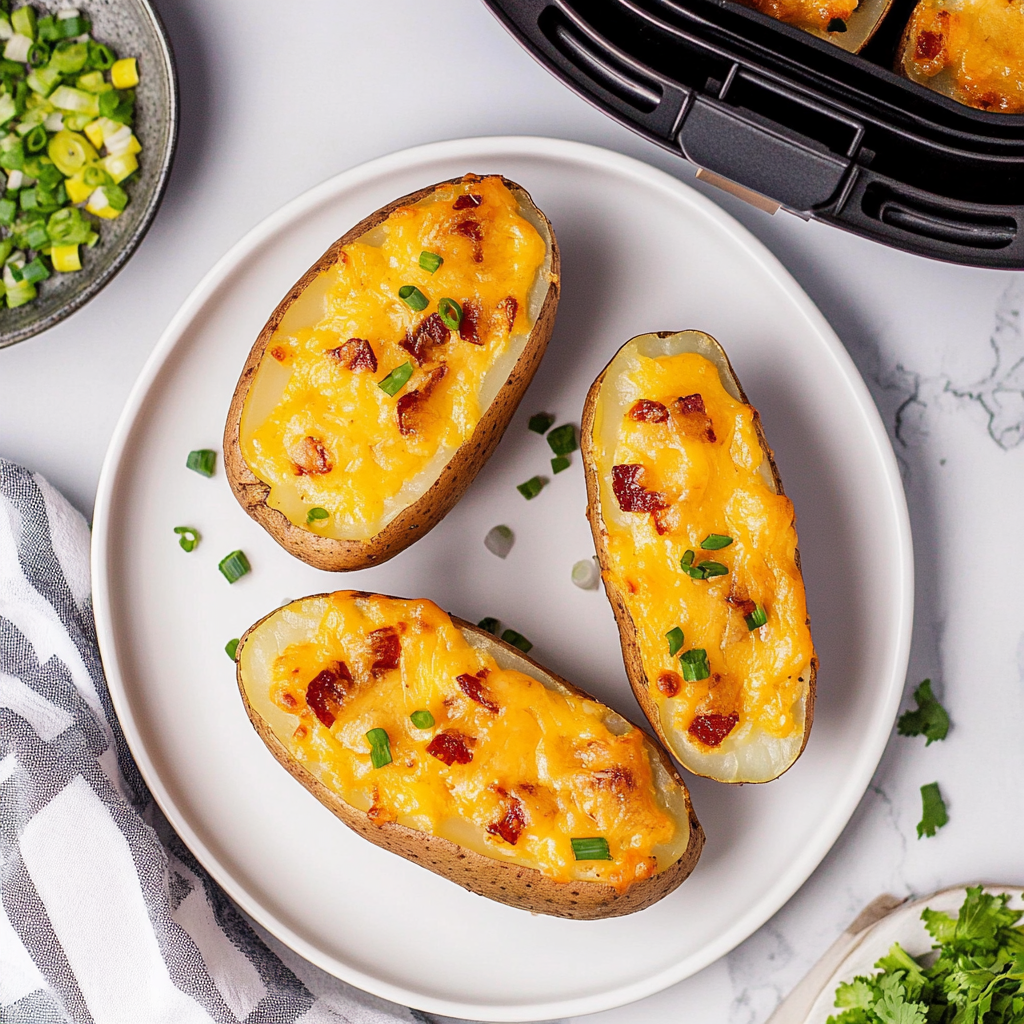 - Air fry again: Return stuffed potatoes to the air fryer and cook at 375°F for 5–8 minutes until golden and heated through.