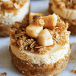 These Apple Crisp Mini Cheesecakes combine two classic desserts into one irresistible bite! A buttery graham cracker crust, smooth vanilla cheesecake, warm cinnamon apples, and a crispy oat topping make this the perfect fall treat.