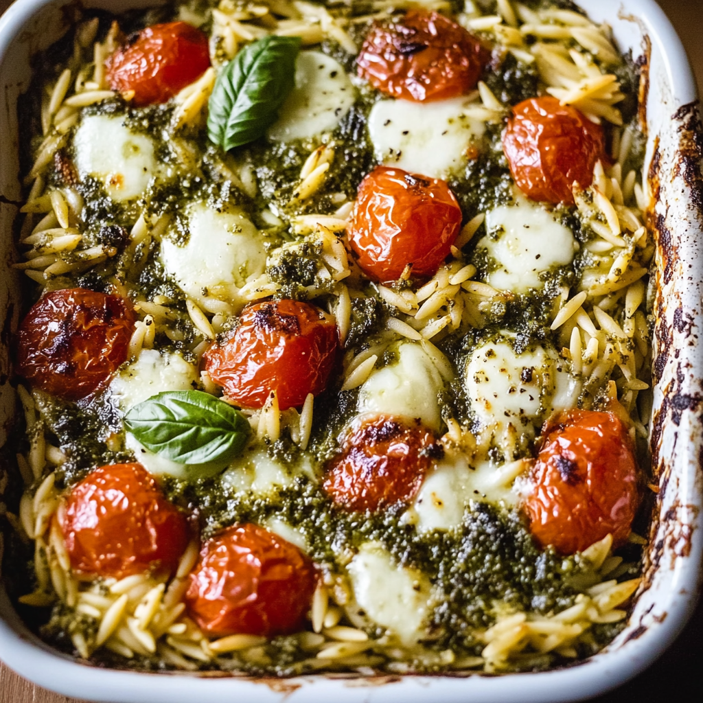 One Pan Caprese Pesto Orzo Bake Recipe