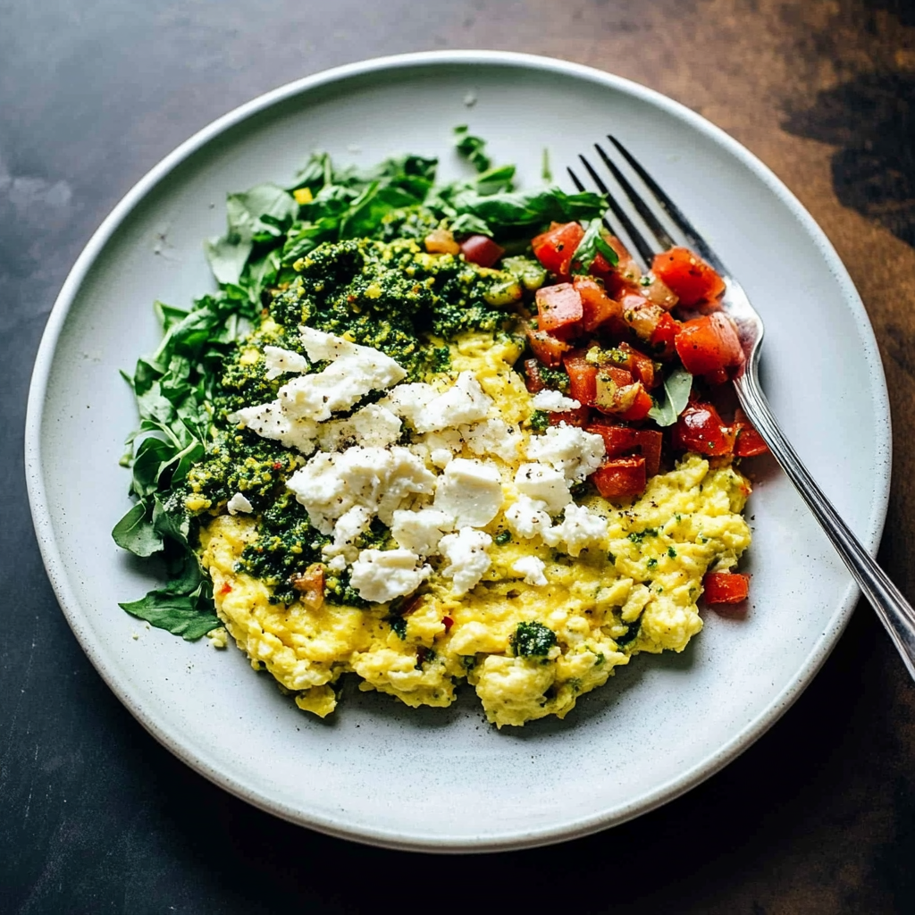 Goat Cheese Scrambled Eggs with Pesto Veggies
