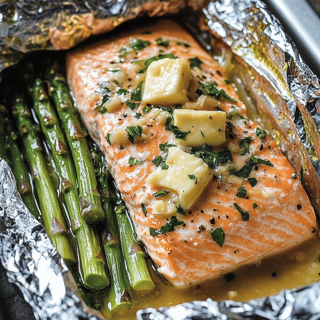 Baked Salmon in Foil with Asparagus and Garlic Butter Sauce