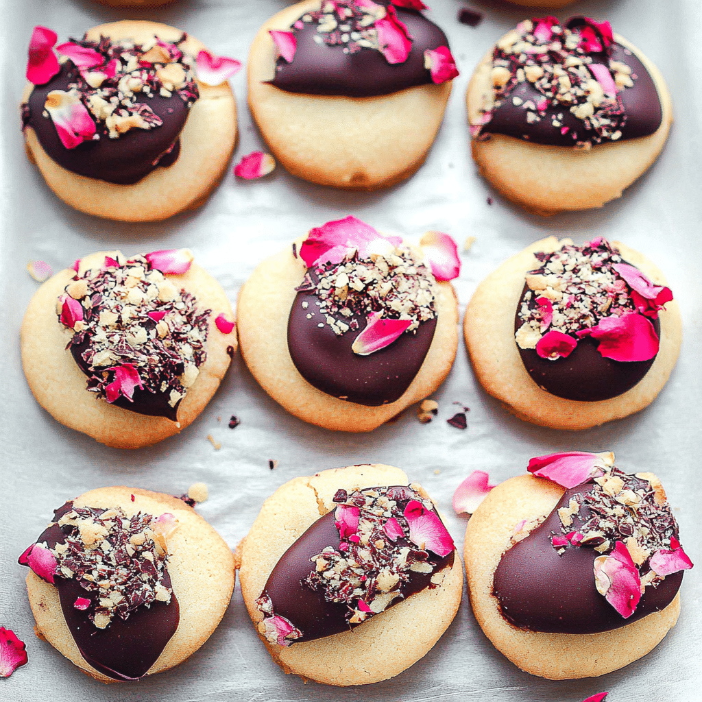 Chocolate Dipped Rose Petal Shortbread Cookies