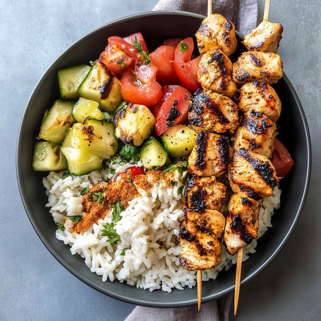 Mediterranean Rice Bowl with Grilled Chicken Tawook Skewers