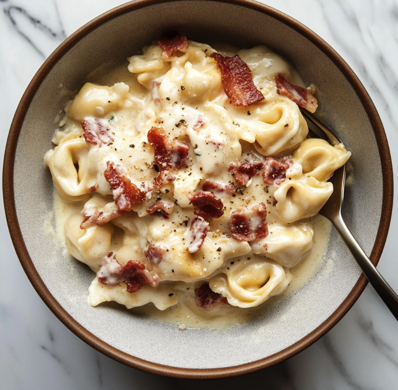 - Combine Everything – Add the cooked tortellini to the sauce, stirring to coat evenly. Sprinkle in crispy bacon and mix well.