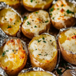 These baked potatoes in foil packets are tender, flavorful, and infused with garlic butter. Topped with a creamy Parmesan ranch sauce, they make the perfect side dish for grilling, roasting, or campfire cooking!