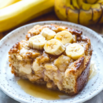- Garnish & serve – Top with banana slices and pecans. Serve warm with caramel sauce or powdered sugar.