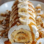 A soft and fluffy banana sponge cake rolled with a luscious caramel cream filling and topped with a caramel drizzle—perfect for an elegant dessert with irresistible flavor.