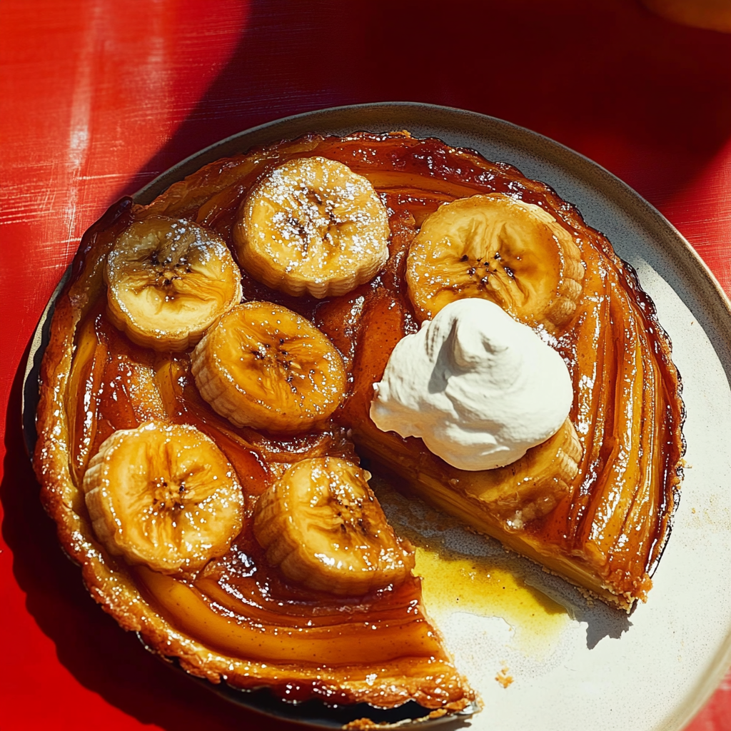 Banana Tarte Tatin is a caramelized upside-down pastry featuring tender bananas baked in rich brown sugar butter and topped with flaky puff pastry. A delicious twist on the classic French dessert.