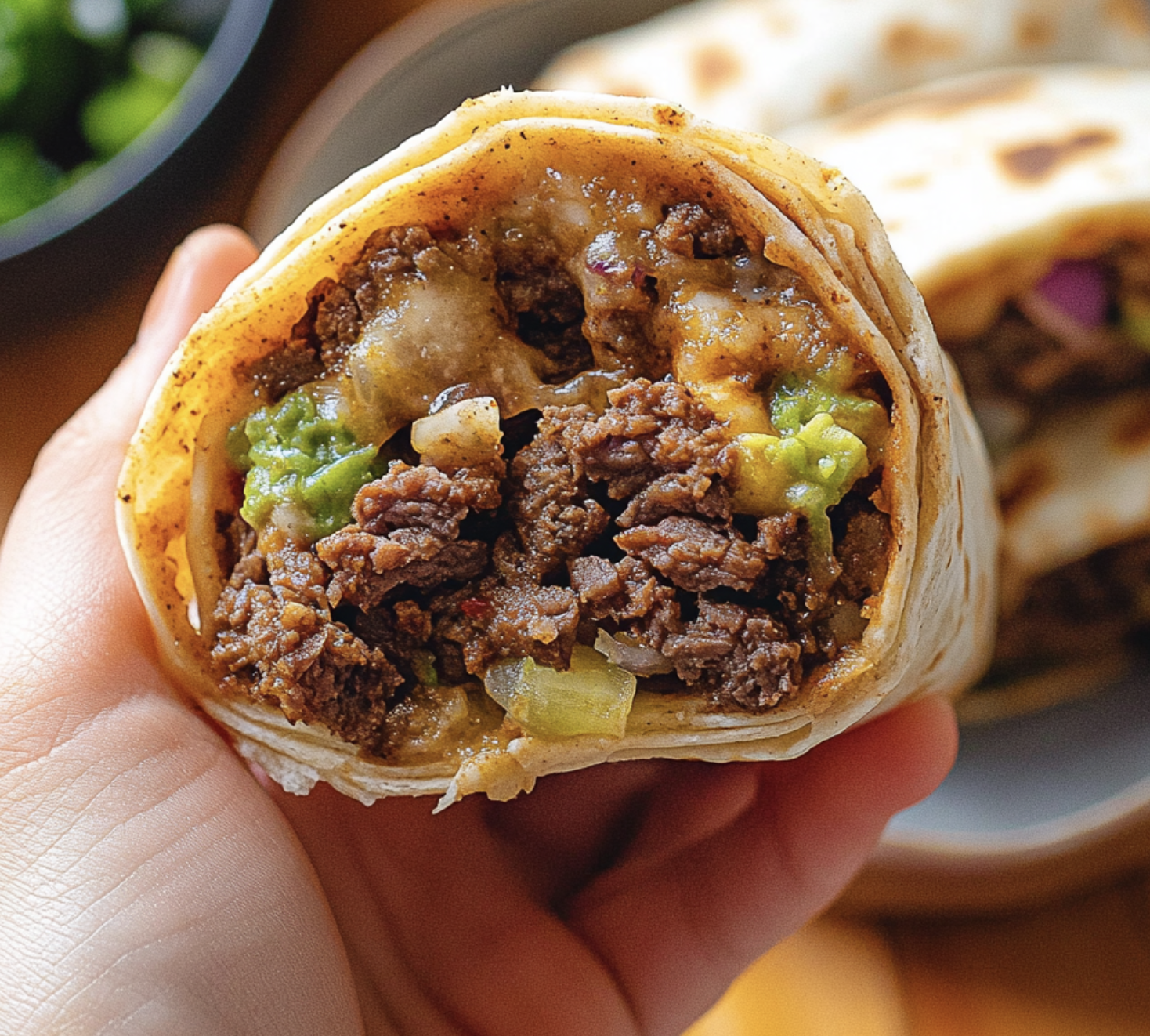 Hearty flour tortillas filled with seasoned beef, beans, cheese, and fresh toppings—a satisfying meal perfect for dinner or lunch.