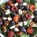 This vibrant salad is a refreshing mix of baby spinach, juicy berries, crunchy pecans, creamy feta, and a drizzle of sweet and tangy balsamic glaze. Perfect as a side dish or light meal, it’s both simple and elegant.