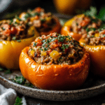 These stuffed bell peppers are baked until tender and filled with a savory beef and rice mixture, topped with melted cheese. A timeless dish that’s satisfying and easy to make.