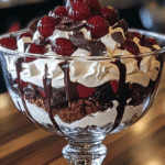 This Black Forest Trifle is a decadent layered dessert featuring moist chocolate cake, creamy whipped layers, cherries, and chocolate shavings. Inspired by the classic Black Forest Cake, it’s perfect for special occasions and is as beautiful as it is delicious.