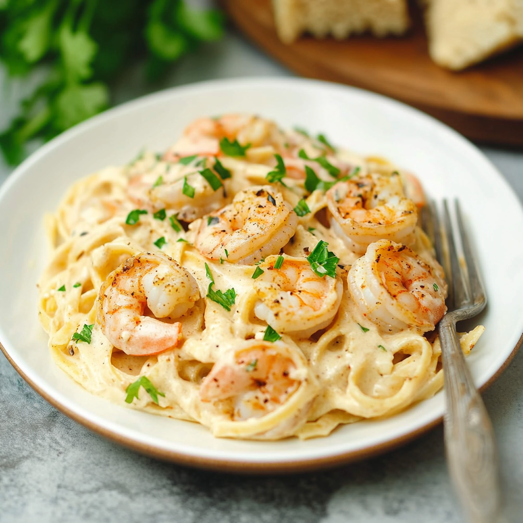 A bold and creamy pasta dish featuring spicy blackened shrimp served over rich Alfredo sauce-coated fettuccine—a flavorful fusion of Cajun spice and Italian comfort.