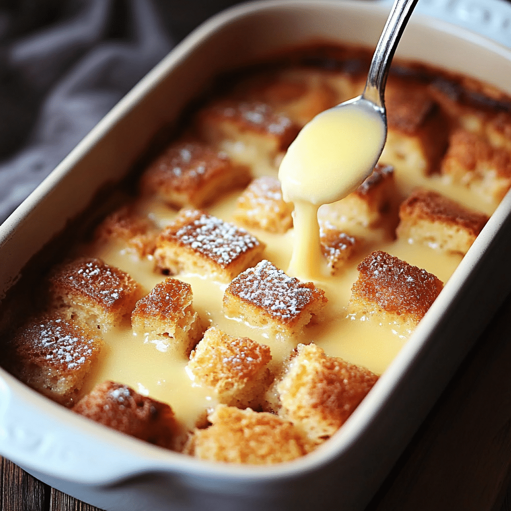 This bread pudding is rich, warm, and custardy, baked to perfection in a casserole dish. Served with a creamy vanilla sauce, it’s the ultimate comfort dessert that’s perfect for family gatherings or a cozy evening treat.