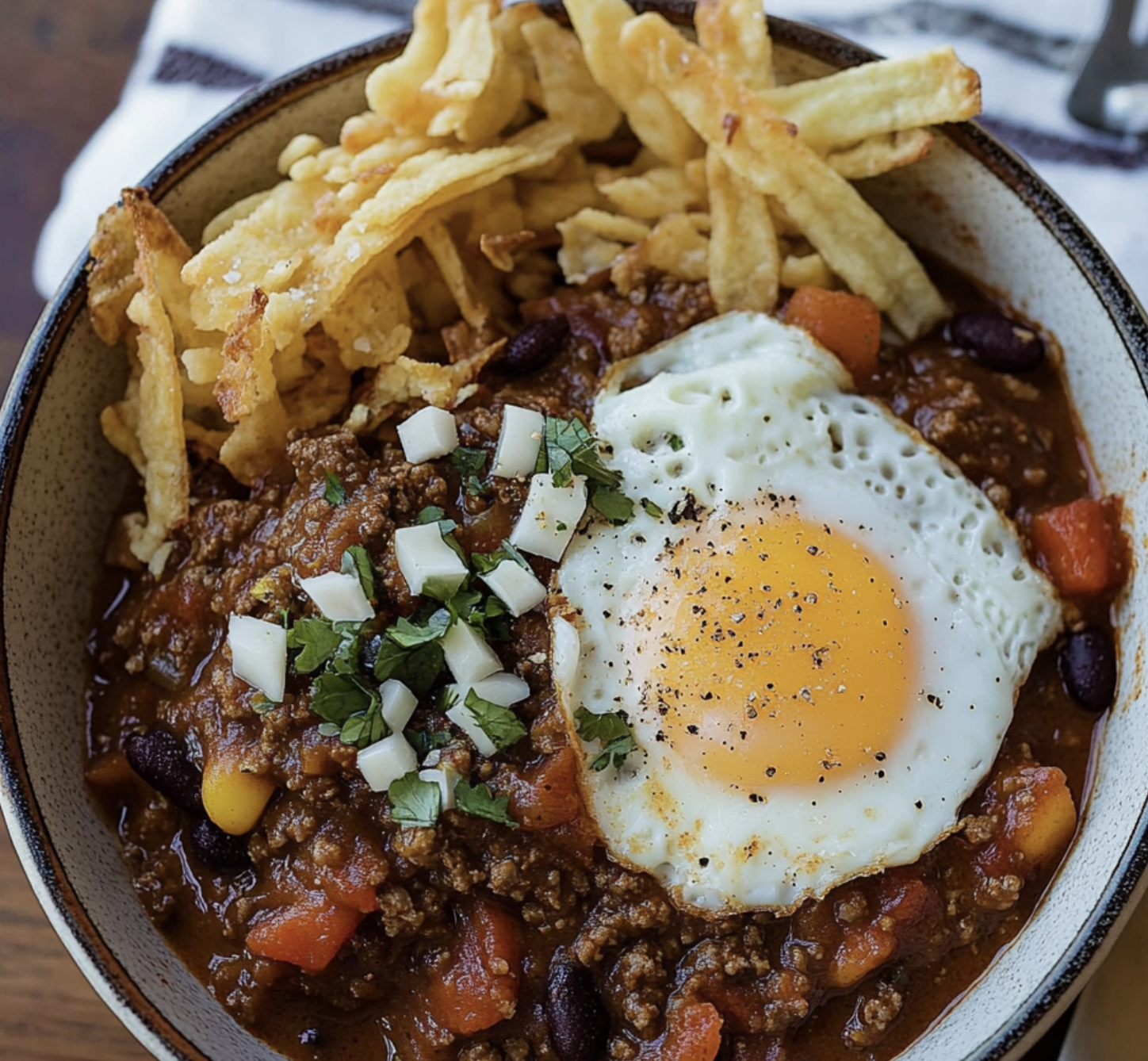 Hearty and flavorful breakfast chili topped with perfectly fried eggs—a spicy, protein-packed dish to kickstart your day.