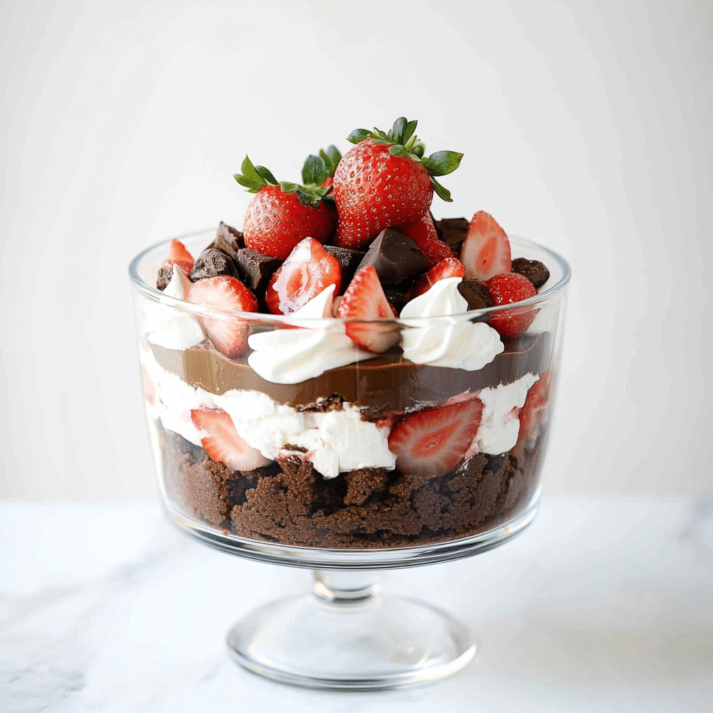 A decadent trifle featuring layers of fudgy brownies, fresh strawberries, vanilla pudding, and whipped topping, creating a harmonious blend of textures and flavors.