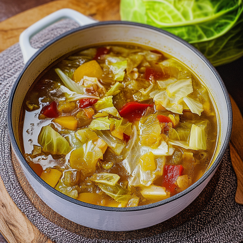 A low-calorie, nutrient-rich soup made primarily from cabbage and other vegetables, designed to support short-term weight loss and detoxification as part of a 7-day diet plan.
