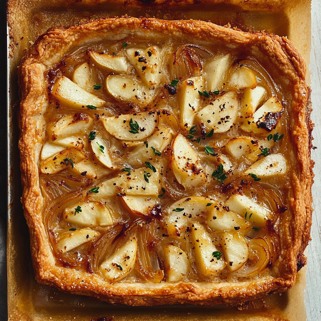 This caramelized onion, apple, and cheddar tart is a sweet and savory puff pastry delight, featuring rich onions, tart apples, and sharp cheddar—perfect for brunch, a light lunch, or appetizer.