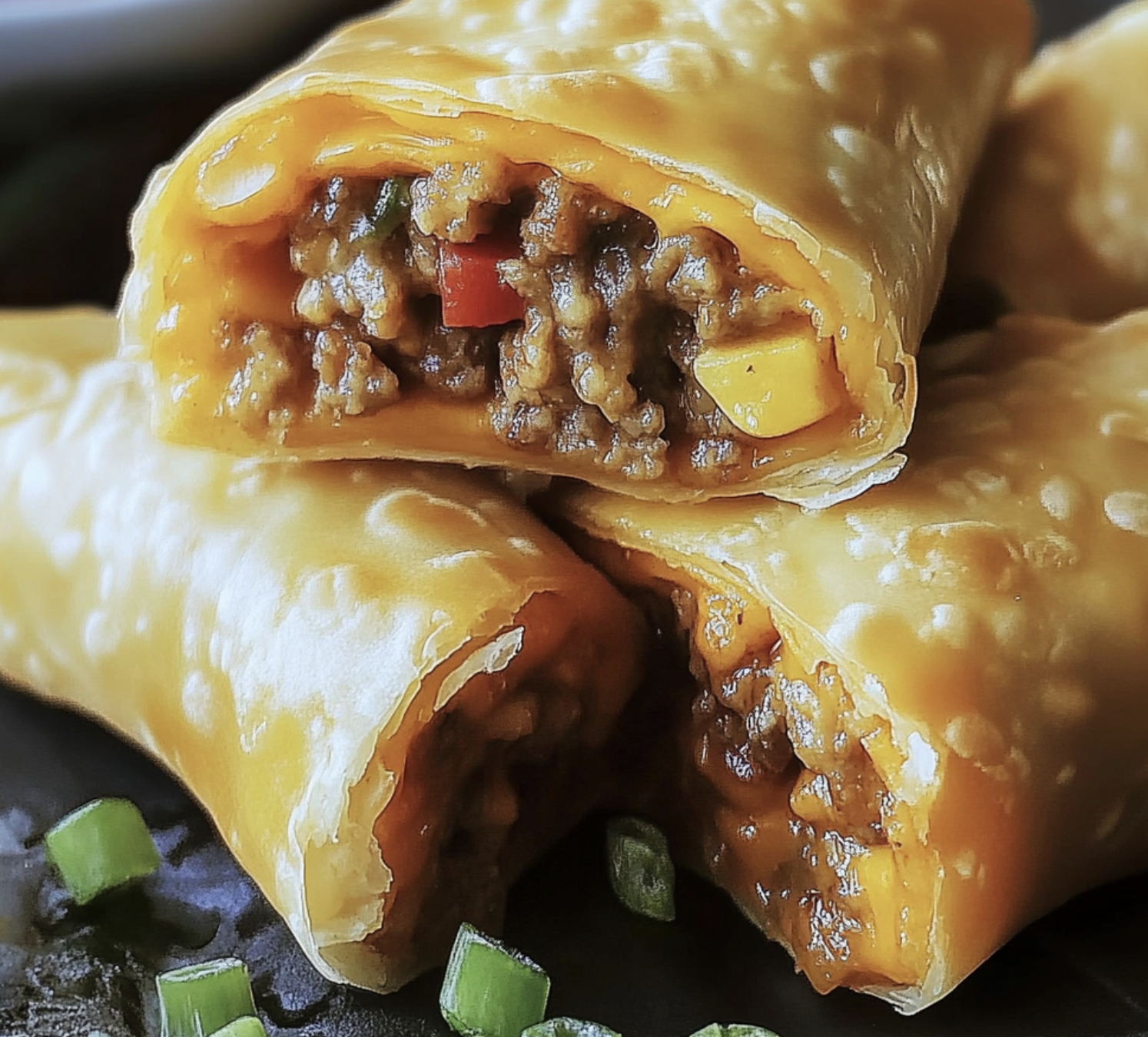 - Combines the flavors of a cheeseburger with the crispy texture of egg rolls.