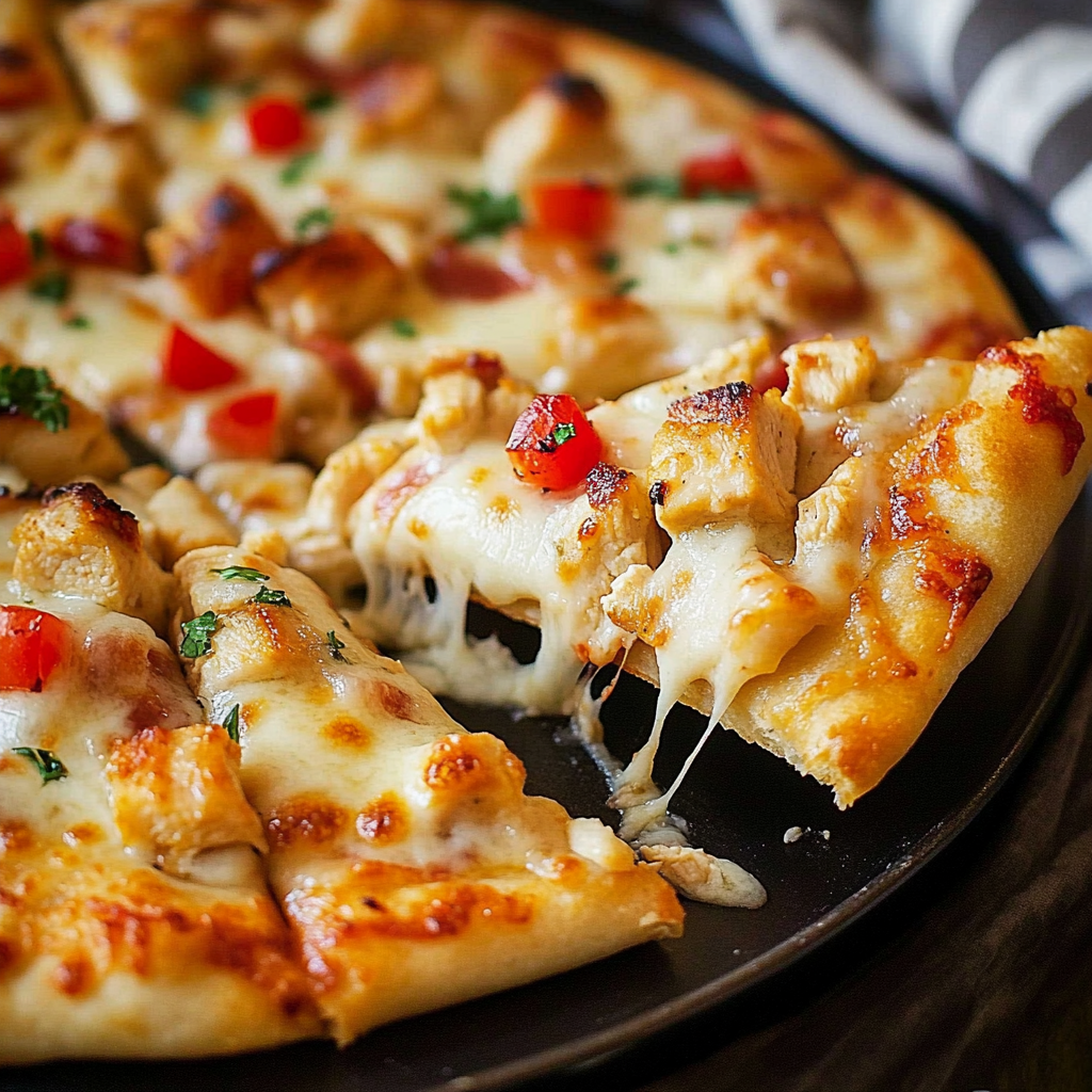 Chicken Alfredo Pizza is a mouthwatering twist on two beloved classics—creamy Alfredo pasta and cheesy pizza. With a velvety white sauce, tender chunks of chicken, and a golden crust, this pizza is both indulgent and satisfying, perfect for weeknight dinners or special occasions.
