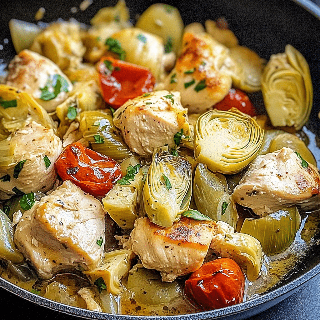 Chicken Artichoke Skillet is a one-pan, easy, and flavorful dish featuring tender chicken, artichoke hearts, garlic, and a lemony white wine sauce. This Mediterranean-inspired meal is light, yet satisfying, making it perfect for a weeknight dinner or a special occasion.
