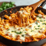 This Chicken Parmesan Pasta Skillet is a one-pan dinner that combines crispy chicken, marinara sauce, melty cheese, and pasta for a comforting, easy meal. No breading required—just simple, delicious flavors!