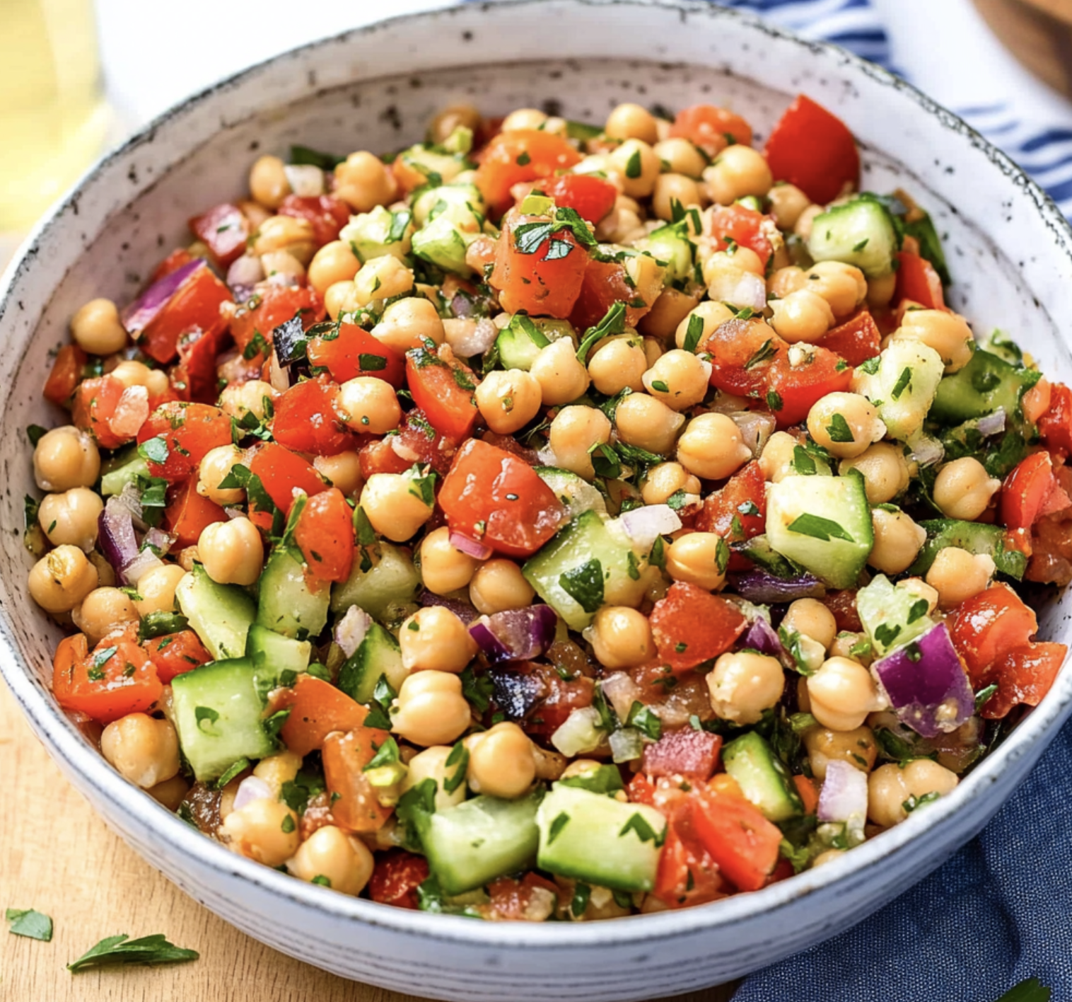 - In a large bowl, combine chickpeas, bell pepper, onion, cucumber, cherry tomatoes, and parsley.
