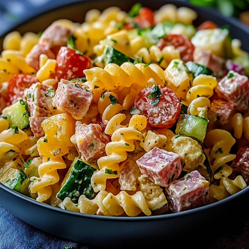 Club Sandwich Pasta Salad is a hearty and flavorful twist on the classic sandwich, combining pasta with bacon, turkey, ham, cheese, and fresh veggies in a creamy dressing.