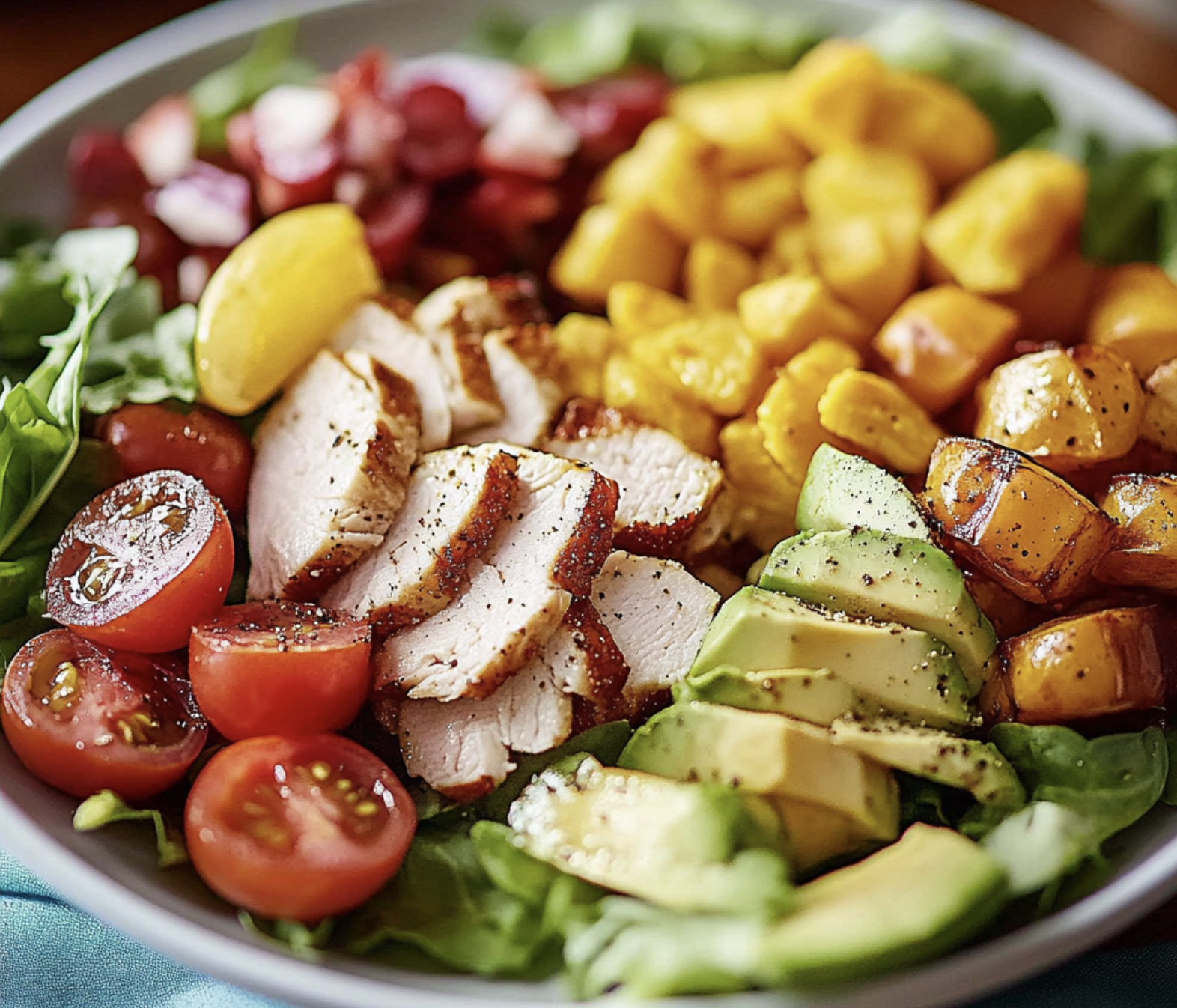 - Neatly arrange rows or clusters of cooked chicken, hard-boiled eggs, bacon, avocado, cherry tomatoes, and crumbled cheese on top of the greens.
