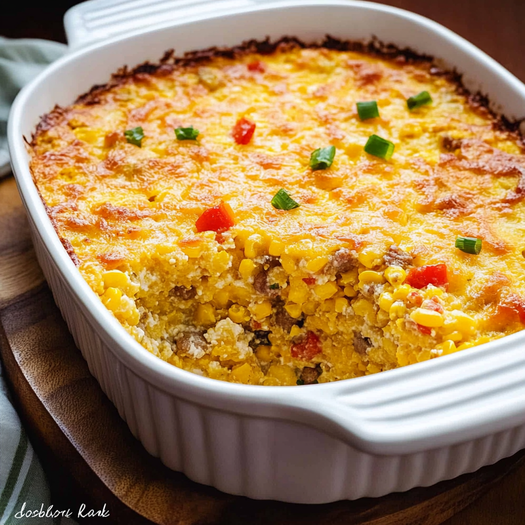 A hearty and savory corn casserole loaded with sausage, creamed corn, and cheese — perfect as a comforting side or satisfying main dish.