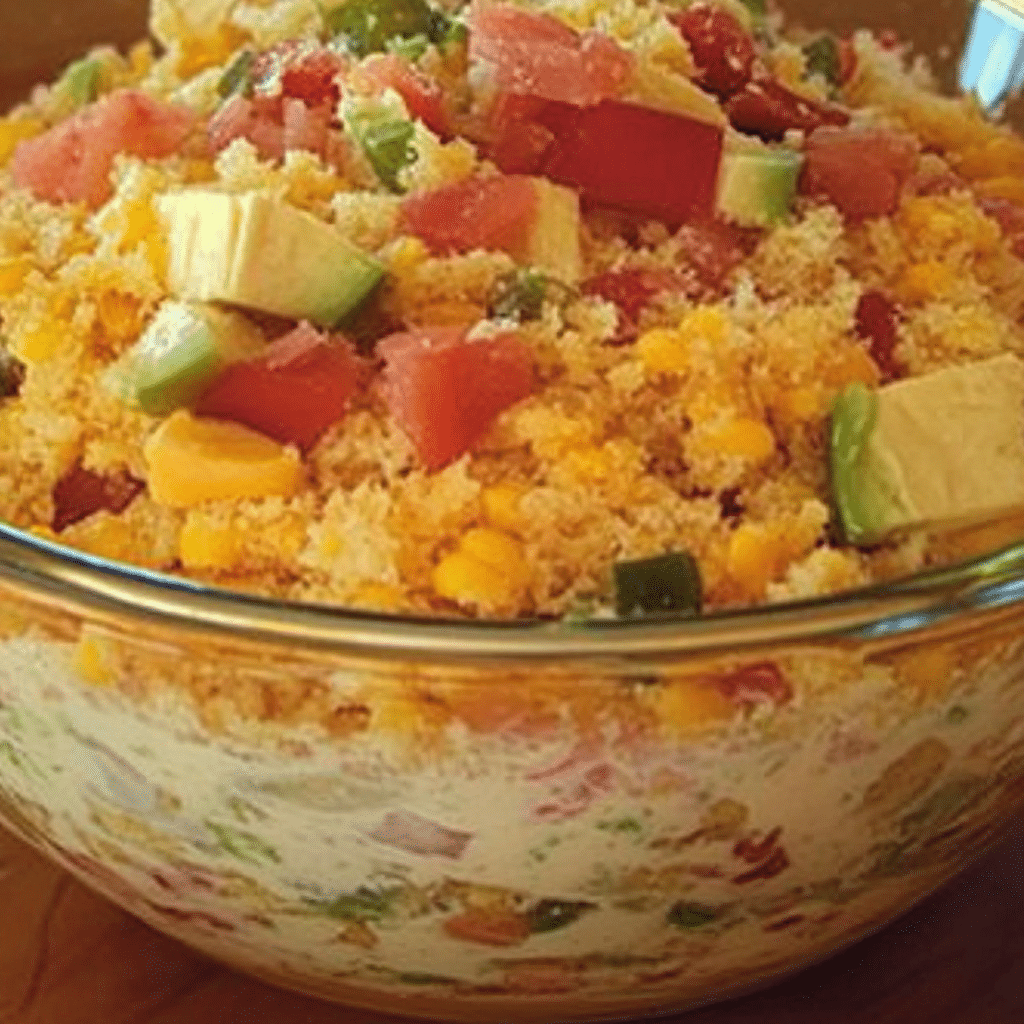 Cornbread Salad is a layered Southern favorite that combines the sweet and savory flavors of cornbread, fresh vegetables, cheese, and a tangy dressing. Perfect for potlucks, family gatherings, or barbecues, this dish is as beautiful as it is delicious. It’s a crowd-pleasing salad with a hearty twist!