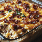 This indulgent breakfast casserole combines savory sausage, crispy bacon, creamy cheese, and hash browns, all enhanced with the irresistible flavor of ranch seasoning. It’s perfect for feeding a crowd during weekend brunches or holiday mornings.