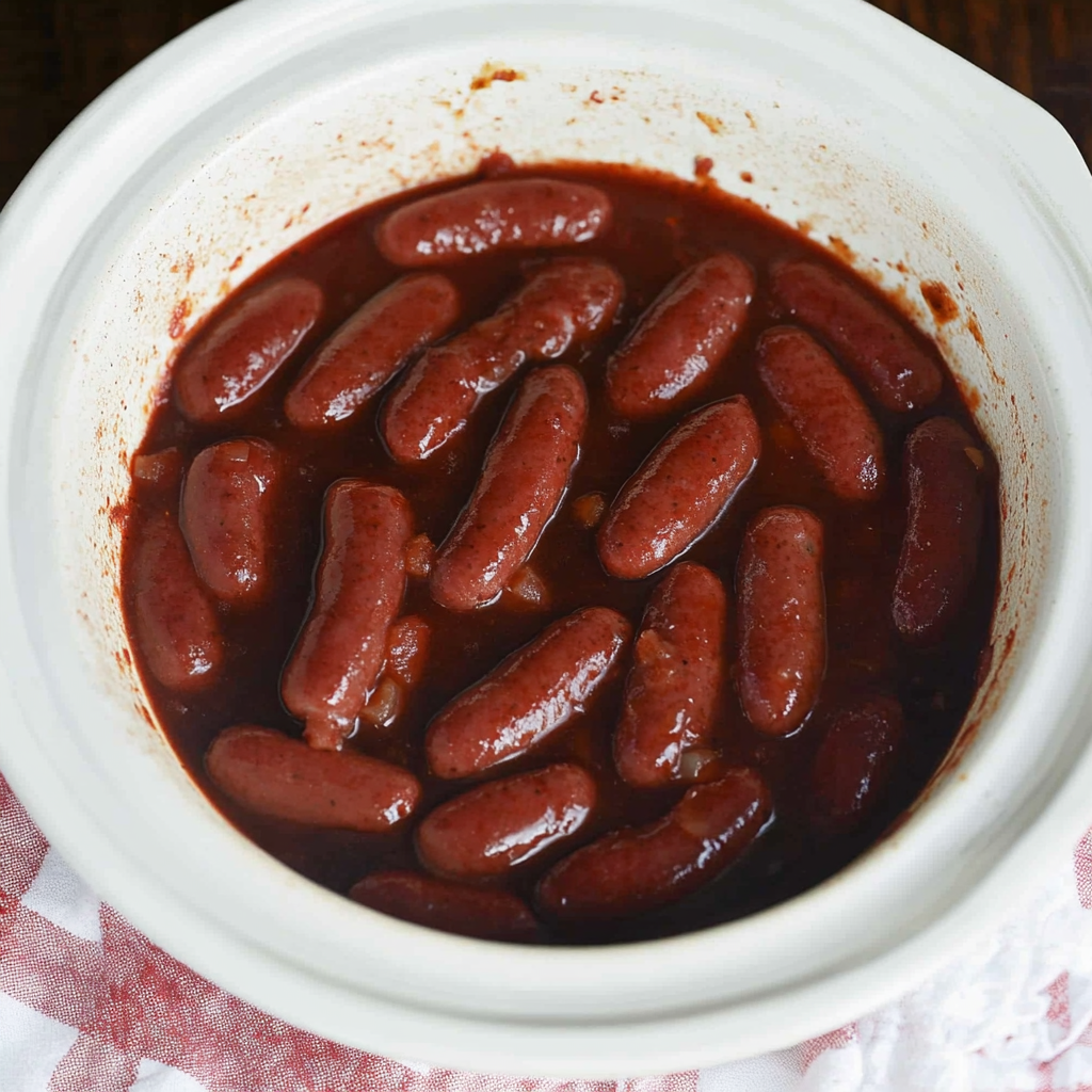 - Add the cocktail sausages and stir to coat them evenly with the sauce.