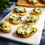 Creamy Baked Spinach Artichoke Crostini is a deliciously rich and satisfying appetizer, turning the beloved spinach artichoke dip into bite-sized delights. Served on toasted baguette slices, this dish offers a warm, cheesy, and tangy topping that’s perfect for entertaining or snacking.