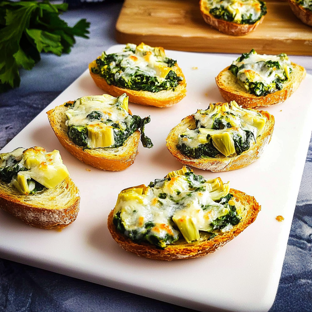 Creamy Baked Spinach Artichoke Crostini are crunchy toasted baguette slices topped with a rich, cheesy spinach artichoke dip. Perfect for parties or appetizers.