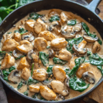 Creamy Chicken Mushroom Spinach Skillet is a delicious one-pan meal made with juicy chicken, earthy mushrooms, and fresh spinach all simmered in a rich, creamy sauce. It’s a quick and comforting dish perfect for a hearty weeknight dinner or a cozy weekend meal.