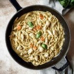 Creamy Chicken Pesto Pasta is a rich and satisfying dish combining tender chicken, al dente pasta, and a luscious cream sauce infused with basil pesto for a flavorful and comforting meal.