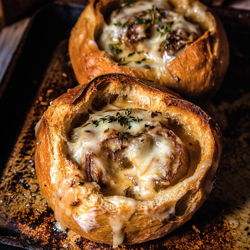 Creamy French Onion Soup Baked in Bread Bowls takes the beloved flavors of classic French onion soup and elevates them with a rich, velvety texture and a rustic, edible bowl. Caramelized onions, creamy broth, and gooey melted cheese come together inside a crusty bread bowl, making each bite warm, comforting, and full of depth. It’s a beautiful, hearty twist on a timeless favorite—perfect for cozy dinners or special occasions.