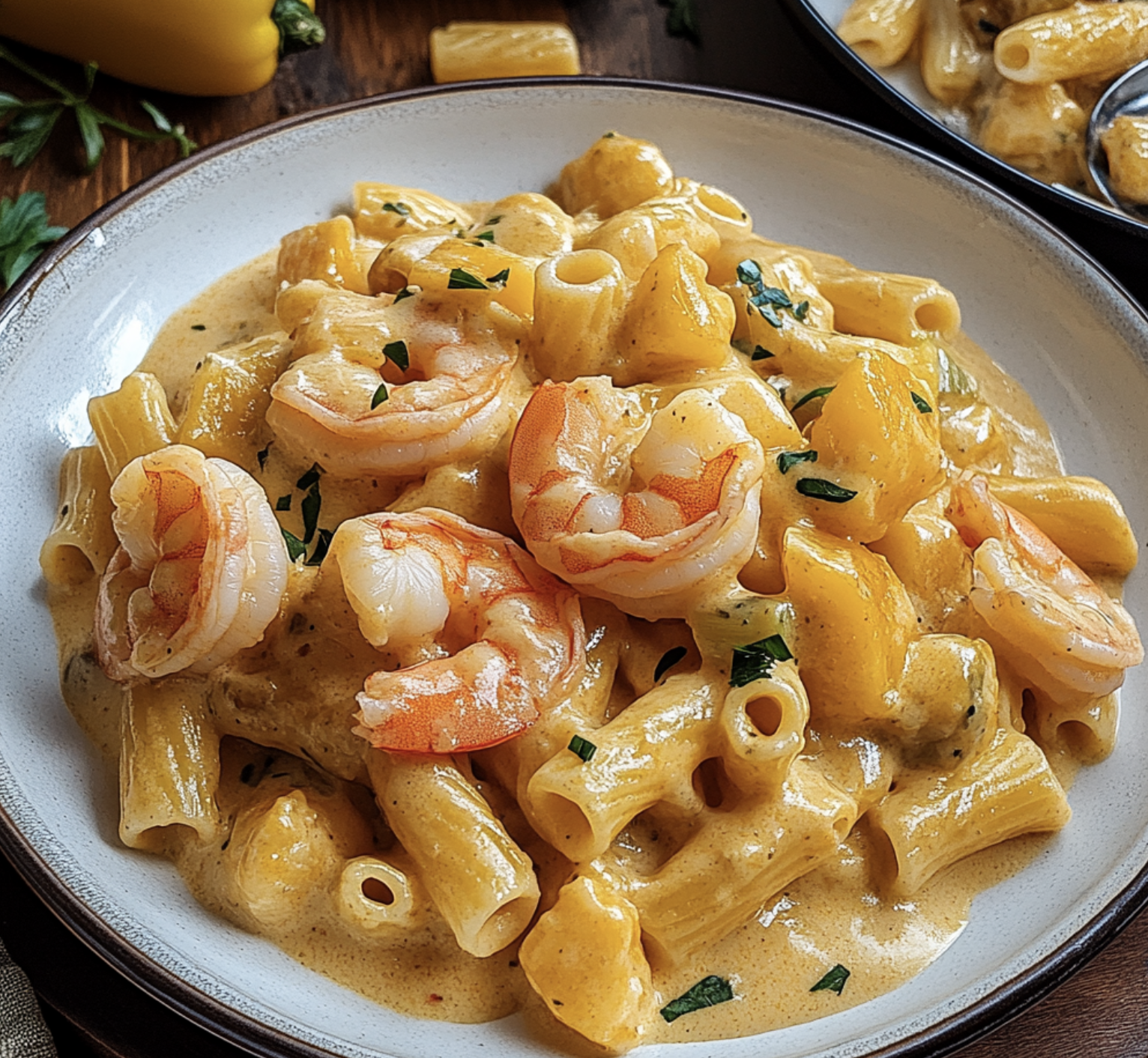 A rich and spicy Caribbean-style pasta dish made with shrimp, colorful bell peppers, and a creamy coconut sauce infused with Jamaican seasonings.