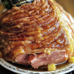 • Pour the glaze over the ham, ensuring it seeps between the slices.