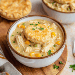 - Serve the creamy chicken pot pie filling in bowls topped with warm, golden biscuits.