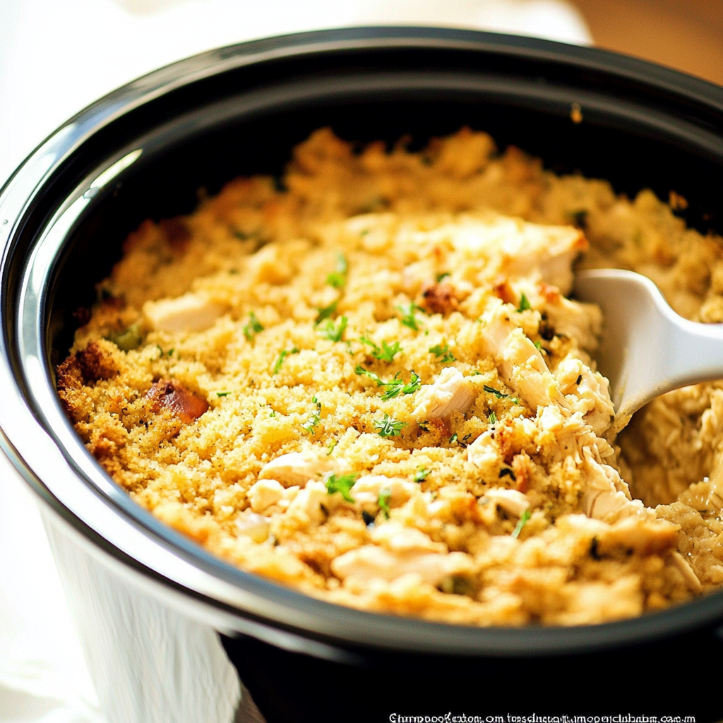 Crockpot Chicken and Dressing Casserole is a comforting Southern-style dish made with tender shredded chicken, savory stuffing mix, and creamy soups, slow-cooked to perfection in one easy pot.