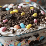 Easter Dirt Cake Casserole is a fun and festive no-bake dessert layered with creamy pudding, crushed cookies, and topped with Easter candies — perfect for springtime celebrations.