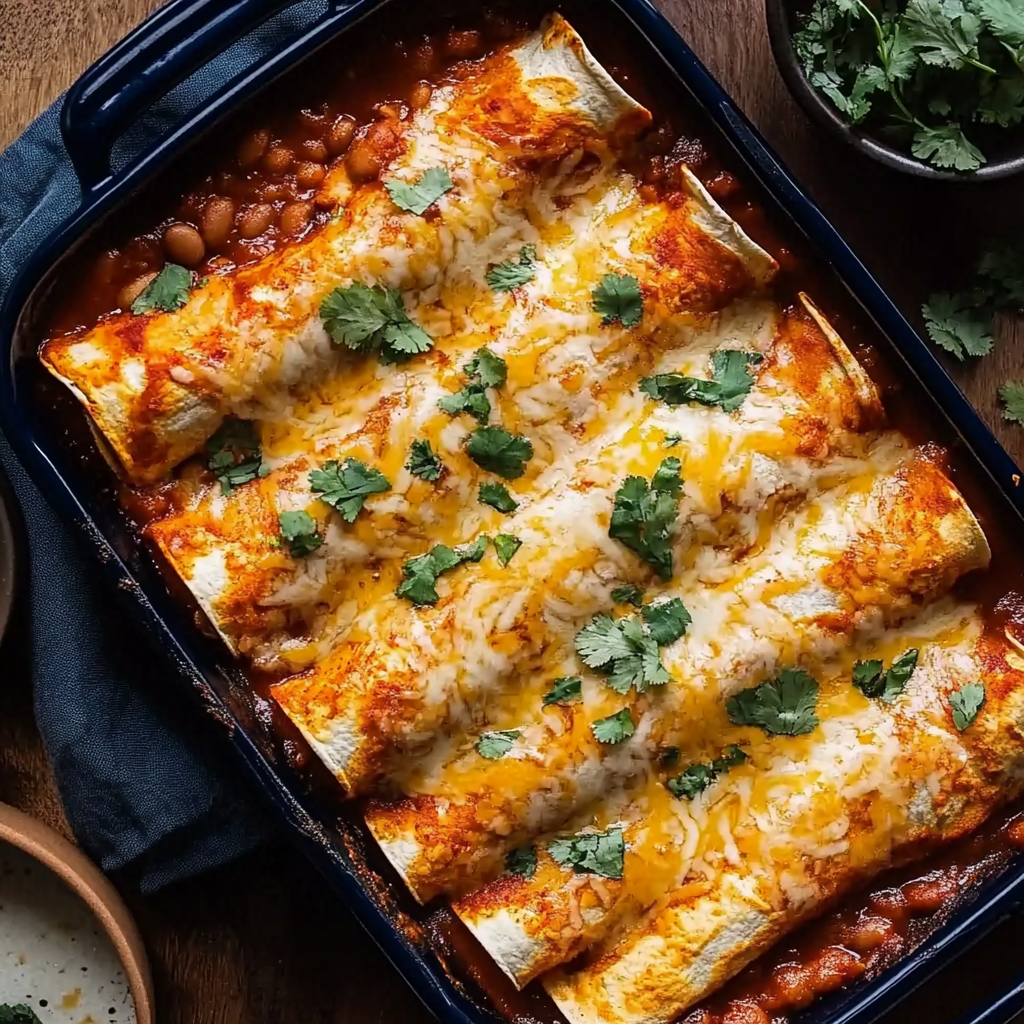 A quick and satisfying Mexican-inspired dish made with flour tortillas filled with seasoned beans and gooey cheese, then baked in enchilada sauce until bubbly and delicious.