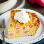 It’s lightly sweet with a tart rhubarb base, soft cake, and a creamy custard-like center.