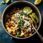 A vibrant, Mexican-inspired quinoa salad with sweet corn, creamy cotija-style cheese, lime, chili, and cilantro—capturing the flavors of street-style elote in a nutritious grain bowl.